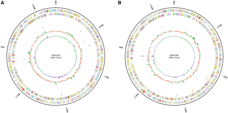 Circular genome representation of (A) CBW1002 and (B) CBW1006. From the outer to inner, circles represent: 1) genome size; 2) forward strand genes, colored according to cluster of orthologous groups (COG) classification; 3) reverse strand genes, colored according to COG classification; 4) forward strand ncRNA; 5) reverse strand ncRNA; 6) repeat regions; 7) percent GC content; 8) percent GC-SKEW.