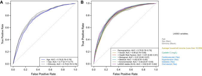 Receiver operating characteristic (ROC) curves from logistic regression models for risk of COVID-19 death. Results are presented for logistic models sequentially including age (light blue), sex (dark blue) and ethnicity (grey) (a). Results are also presented for a model sequentially including (N = 4) demographic (grey), (N = 12) social (beige), (N = 7) health risk (red), (N = 6) biological (green), (N = 10) medical (light blue), and (N = 4) environmental (olive green) factors, as well as a model including the (N = 7) factors consistently selected by logistic LASSO (selection proportion > 0.95) (purple) (b). Predictive performances were derived from a subsampling procedure (repeated independently 1000 times) of 80% of the study population as training set to produce ROC curves and corresponding AUC in the validation set (remaining 20%). The ROC curve and AUC point estimate corresponds to mean performance across 1000 subsamples, and the coloured areas (and AUC ranges) reflect the 1st and 99th percentiles of the performances yielded across the subsamples