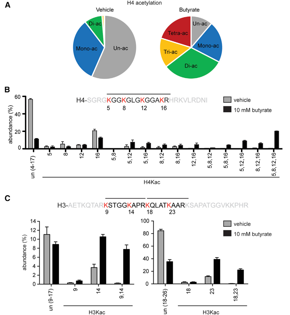 (A) Pie charts summarizing mass spectrometry analysis of H4 peptide acetyl states (un-, mono-, di-, tri-, or tetra-acetyl) identified in HeLa cells treated with vehicle or sodium butyrate.