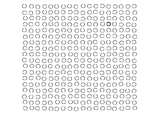 Sequential scanning task. The task included 50 trials, arranged in 5 blocks with 10 trials each. The number of trials differed from the reading task to adjust for the processing time between tasks. For every trial, a different sequential scanning display was generated beforehand. The visual display consisted of an 18 x 18 grid containing black Landolt Csij (i = horizontal position, j = vertical position) on a white background, with a line width of 0.08°, and an opening (gap size: 0.08) at one of the four positions: left, right, top, bottom (see Figure 1 for an example array). Symbols had a diameter of 0.88°. Average horizontal and vertical distance between stimulus elements was 1.32° (measured center to center). The position of Landolt Cs varied horizontally and vertically around the grid centers. This spatial jitter corresponded to one eighth of the size of a Landolt C (± 0.11°). Line thickness of the start symbol was doubled. The end symbol was defined by a closed ring without a gap. Sequence length of the visual scan path was 50 to 60 symbols in each scanning display.