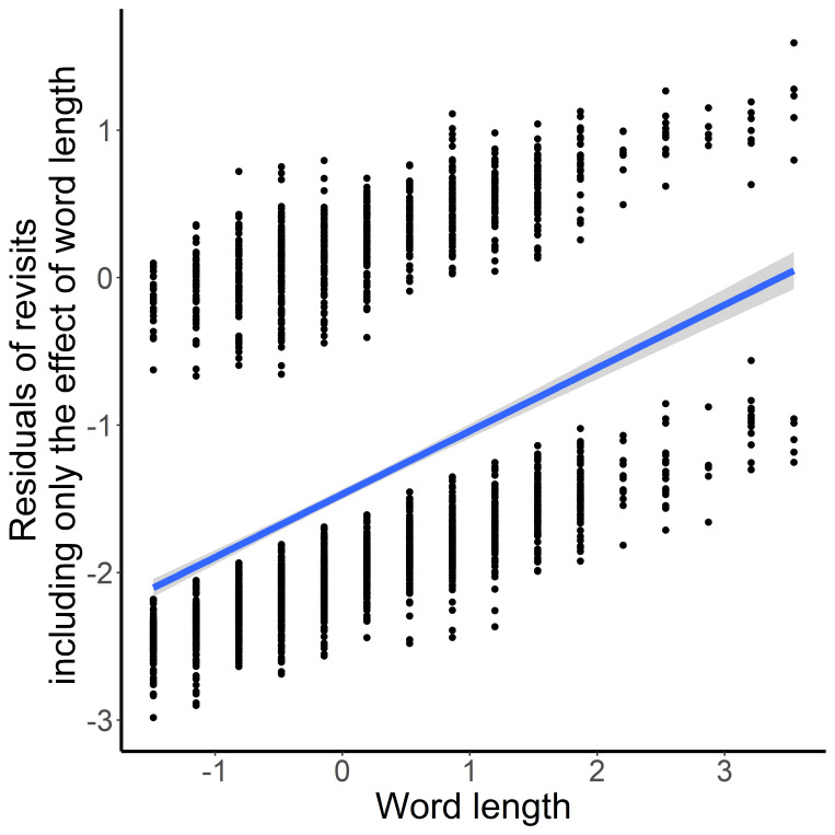 Third, we also analysed whether a regression occurred on a word after its first reading (coded as a binary variable). The amount of revisits or regressions are usually interpreted as an indicator for comprehension difficulties (e.g. [53, 54]). Also for this analysis only words from the two Davis texts satisfying the above mentioned criteria were used.