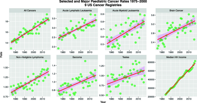 Inspection of the SEER*Explorer website shows that at the national level that age-adjusted rates of several cancers in the pediatric age group (younger than 20 years) are rising including all cancer and acute lymphatic leukaemia which is the commonest tumour. The annotation on the SEER website is made from the JoinPoint program which also comes from NCI and CDC. These tumours are listed in Table 1 and illustrated in Fig. 1 using data based on 9 US cancer registries 1975–2017. Supplementary Figure 1 shows other cancers which are mostly rising utilizing data from 21 US cancer registries 2000–2017.