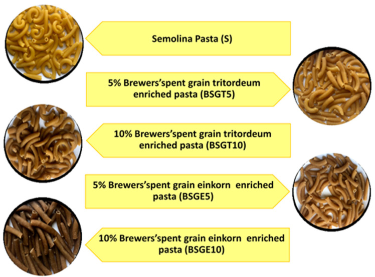For this study, two different types of BSG were used to enrich pasta. One pilsner-type BSG (BSGE) was derived from a homemade brewing process, performed in a lab-scale plant, of a mix of two malts obtained from a hulled and a dehulled cultivar of einkorn, Norberto and Hammurabi, respectively. The other pilsner-type BSG (BSGT) was derived from the brewing of a malt from a hexaploid tritordeum line.
