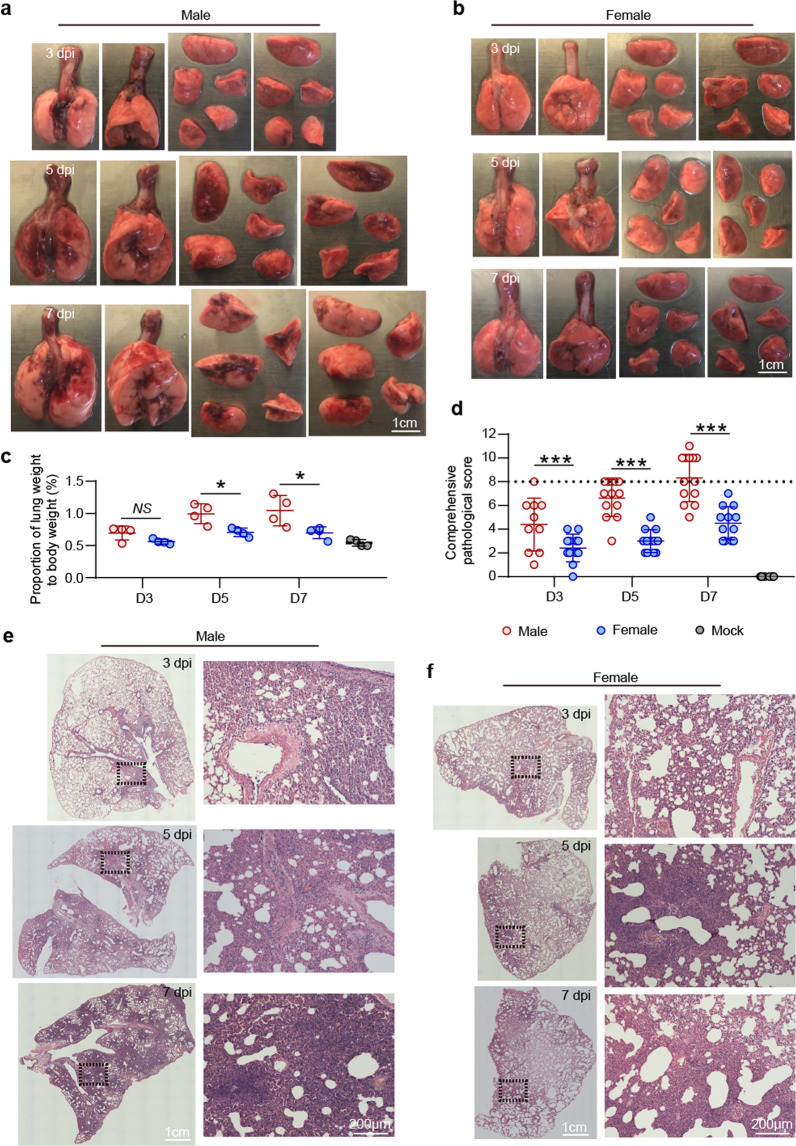 Current pandemic of severe acute respiratory syndrome coronavirus 2 (SARS-CoV-2) has been causing a rapid increase of cases of coronavirus disease 2019 (COVID-19), which has been exerting a devastating harm to public health, economy, and social communication worldwide. Because lung is the main target organ of SARS-CoV-2, typical clinical symptoms include fever, cough, and weakness that were observed in ~80% of COVID-19 patients, and 20% of them develop respiratory difficulties and organ failures.1,2 The pathological changes of lung include pneumonia, alveolar septum consolidation, and pulmonary edema among the severe cases. The outcomes of SARS-CoV-2 infection, and the progression and consequences of COVID-19 are complicated. The mechanisms of how SARS-CoV-2 causes different degrees of symptoms are unclear. Clinically, risk factors such as gender, age, and underlying diseases might be related to the severity of COVID-19. Several recent cohort studies have suggested that SARS-CoV-2 infection causes more severe lung diseases and higher mortality in male than in female.3–6 It was also found that males are more susceptible to SARS-CoV infection than females by epidemiological studies7,8 and animal studies in mice.9 Therefore, investigating the gender bias in SARS-CoV-2 infection will improve our fundamental understanding of the pathogenesis of COVID-19 and help the development of prevention strategies of SARS-CoV-2 infection. However, a detailed pathological study regarding gender bias of COVID-19 in an animal model is still lacking. Recently, an outbred rodent strain, Syrian hamster, has been demonstrated to be a susceptible animal mode for SARS-CoV-2 infection.10–12 Hamsters showed rapid loss of body weight, viral shedding in nasal washings and lung tissue injury throughout a 7-day SARS-CoV-2 infection course.10–12 In this study, we applied the Syrian hamster as a model to not only study the pathogenesis of SAR-CoV-2 infection but also investigate whether gender could play a role in SARS-CoV-2 infection.
