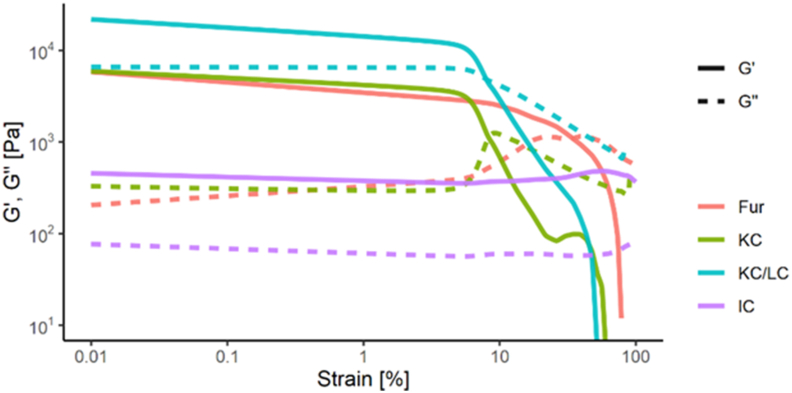 Figure 5 shows storage modulus (G′) and loss modulus (G″) curves as a function of strain. The carrageenan gels present characteristic curves of well-structured systems with long linear viscoelastic regions reached up to 4% for KC and KC/LC gels and 10% for Fur gels, and decreasing trends over this threshold. The decrease can be explained by syneresis, which caused gel slippage between the plates of the rheometer.
