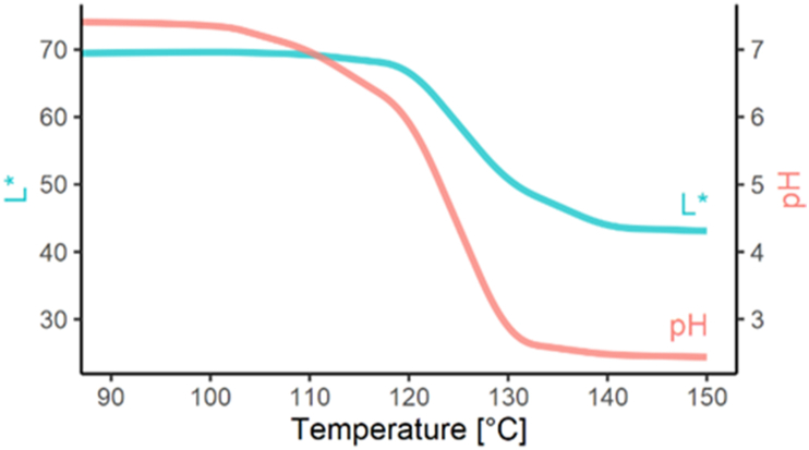 The dependence of furcellaran lightness (L∗) and 1% (w/v) furcellaran solution pH on the drying temperature.