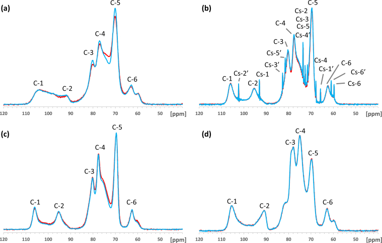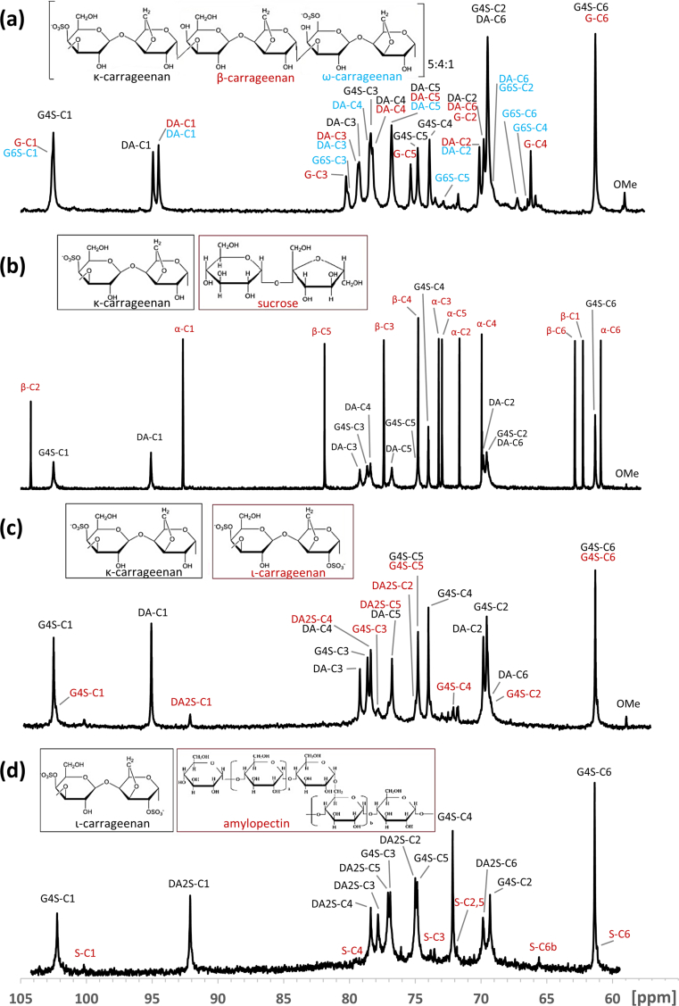 13C-NMR spectra of carrageenans. 13C-NMR spectra of carrageenans. (a) furcellaran, (b) κ−carrageenan, (c) κ/λ−carrageenan, (d) ι−carrageenan.