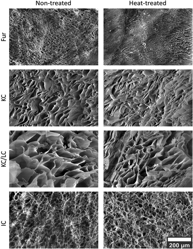Changes in the morphology of the Fur and carrageenan gels before and after heat treatment were assessed using the SEM technique (Figure 8). It was observed that the gel skeleton structures of the hydrogel samples formed porous networks, Fur was similar to IC, and KC was similar to KC/LC. The first mentioned samples had a characteristic honeycomb structure, whereas KC and KC/LC exhibited long cross-linked tubular structures with rectangular pores. The effect of heat treatment was observed only for the Fur gel network, which lost the cross-linking, resulting in a decrease in gel hardness.