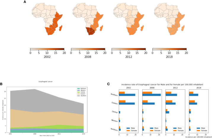 Esophageal cancer incidence rates per year, by African region and by gender. (A) Esophageal cancer incidence per 100,000 inhabitant in African regions. (B) Dynamics of incidence rates from 2002 to 2018. (C) Esophageal cancer incidence by gender.