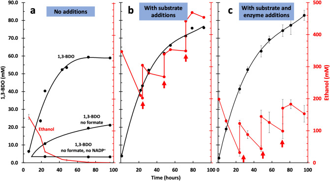 Conversion of ethanol to 1,3-BDO. Results for implementation of the full system described in Fig. 1 are shown. The 1,3-BDO concentrations are shown in black and ethanol concentrations are shown in red. (a) Results for the full system including results leaving out formate or leaving out formate and NADP+. The ethanol consumption time course corresponds to the full system. (b) The same implementation except that extra ethanol and formate were added at various times (indicated by the red arrows). (c) The same implementation except that extra formate, ethanol, Nox and DERA enzymes were added at various times (indicated by the red arrows). Error bars reflect standard deviations of biological triplicates.