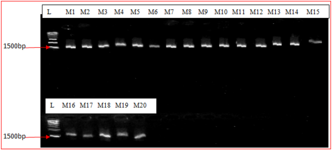Gel electrophoresis image of PCR amplified 16S rRNA gene of 20 bacterial isolates on 1.4 % agarose gel. L, 1 kb DNA ladder from New England Biolabs, USA; size is indicated on the left hand margin. Lane M1-M20, bacterial isolates from cowpea root nodules.