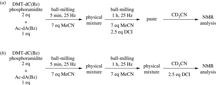 It is important to note that caution is needed when interpreting the results of mechanochemical reactions, as the mechanisms by which such reactions occur can sometimes be disputed. For example, supposed cases of ‘dry’ solid–solid reactions have been argued to have been examples of liquid- or solvent-assisted reactions [19,23,24]. To demonstrate that the reaction was occurring in the milling vessel, and not being facilitated by trace amounts of solvents that had been used for co-evaporation or by addition of CDCl3 for NMR analyses, a set of experiments was performed (figure 5) in which Ac-dA(Bz) and DMT-dC(Bz) phosphoramidite were used as supplied commercially, with no co-evaporation performed. For these experiments, equivalents of DMT-dC(Bz) phosphoramidite 1 were increased from 1.5 to 2 to account for additional hydrolysis that may occur, and total molar equivalents of MeCN were increased from 10 to 14 to account for the additional mass in the vessel. Furthermore, to eliminate the possibility that the reaction was occurring upon addition of the deuterated solvent for NMR analysis, one reaction (a) was performed in which DCI was added after the pre-milling step, as described in table 2 entries 8–11, and the second reaction (b) was performed with DCI being added only after milling was complete after 1 h. The deuterated solvent for these experiments was also changed from CDCl3 to CD3CN. DMT-dC(Bz) phosphoramidite 1 and the product 3 are both soluble in CD3CN, whereas Ac-dA(Bz) 2 is not. This reduced the possibility of a reaction occurring after the deuterated solvent had been added to the reaction mixture.