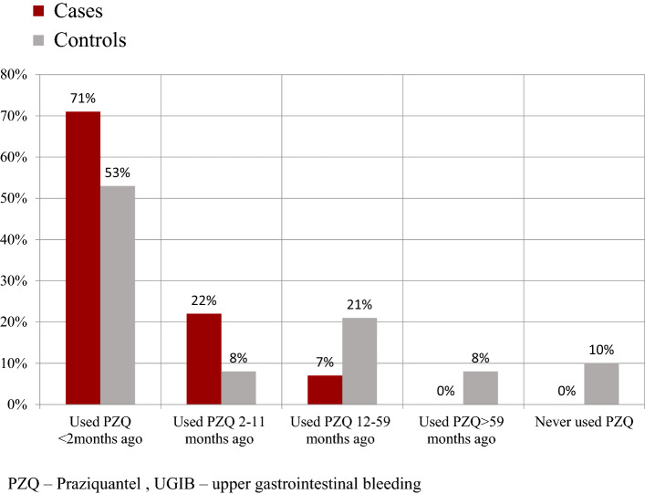 Among the cases, 85 out of the 92 episodes of UGIB (93%; 95% CI 78–98) were experienced by those cases who received PZQ within the last 11 months. Among controls, 119 out of the 192 episodes of UGIB (62%; 95% CI 55–69) were experienced by those who received PZQ in the last 11 months. All cases received PZQ, while 13 (20%) controls with 20 lifetimes episodes of UGIB had never received PZQ during their lifetime. Figure 2 summarizes these findings.