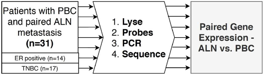 Patients with stage 2-3 PBC with macrometastasis to an ALN were selected. Gene expression of 2,567 cancer-associated genes was analyzed with the HTG EdgeSeq system coupled with the Illumina Next Generation Sequencing (NGS) platform. Changes in gene expression between ER/PR positive, HER2 negative PBC and their paired ALN metastases were compared with TNBC and their paired ALN metastases.