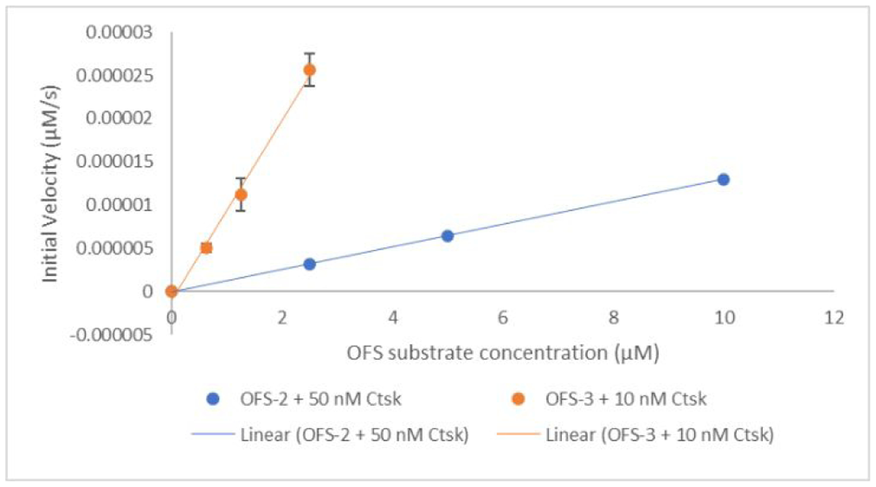 Comparison of initial rates of Ctsk catalyzed cleavage between fluorophore and quencher pair of OFS-2 and OFS-3 in 50 mM NaOAc buffer at pH 5.5. Fluorescence measurements were taken at 1 min intervals using a Biotek Synergy H4 plate reader on solutions in black Corning 3720 96-well plates incubated at 37°C. For the linear data fits, r2 was ≥ 0.99 (OFS-3, data points are triplicate averages).