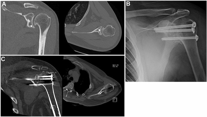 The conversion of shoulder arthroplasty to GHA is an extremely challenging situation due to the extensive bone loss and soft tissue deficiency. Scalise and Iannotti [3] reviewed seven patients who underwent GHA after prosthetic arthroplasty failures. Two of the patients experienced persistent nonunions, and another two patients underwent revision bone-grafting for delayed union. However, at the time of the latest follow-up, the patients’ subjective shoulder function and pain were significantly improved (p < 0.03). Another review by Miller et al. examined 11 children who experienced a flail shoulder secondary to polio and underwent GHA [40]. Although six patients underwent hardware removal secondary to pain, two required osteotomies to correct rotation, and one underwent revision for nonunion. All patients reported satisfaction and minimal pain at a mean follow-up of 41 months.