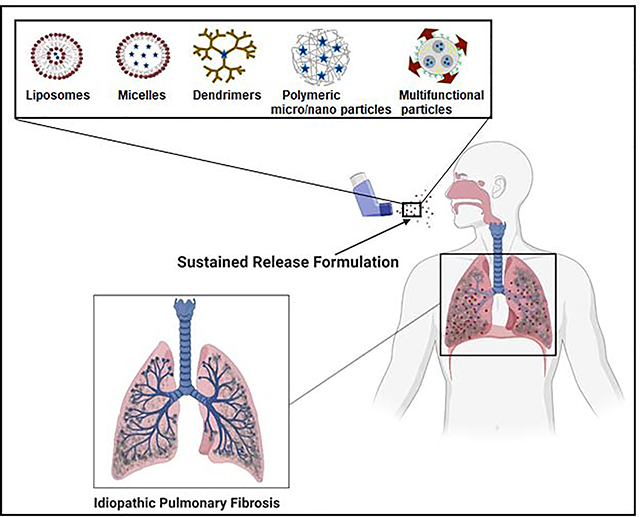Despite these reported off-target toxicities, pirfenidone and nintedanib remain the only two drugs approved for IPF treatment so far. Therefore, there is a need for effective approaches for site-specific and sustained delivery of these drugs to maximize their efficacy. An approach to increase the effectiveness and reduce the overall toxicity of drugs is to encapsulate them within nanoparticle (NP) or microparticle (MP) formulations, which can also be used to achieve sustained drug delivery. For instance, inhalable NP formulations are preferred in order to achieve localized therapy in a fast, easy and patient-compliant manner [11]. In addition, NP formulations offer the opportunity to encapsulate multiple therapeutic agents within a single formulation, for combination therapy. Evaluating combination therapies to treat IPF is an ongoing process given that there are no FDA-approved combination therapies for IPF thus far. With combination therapy, two drugs are together expected to have an additive or a synergistic effect in combating fibrosis, which cannot be achieved using a single drug. This review discusses potential targets and emerging therapies that can benefit from encapsulation within drug carriers and delivery by pulmonary route, and provides an exhaustive overview of current literature on the development of NP-based as well as MP-based formulations for anti-fibrotic drug delivery to treat IPF.