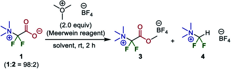 Therefore, esterification was investigated as a method of isolating and purifying the difluoroglycine derivative without decarboxylation. First, MeI was employed as a methylating reagent. However, established conditions using MeI in DMF or an excess amount of MeI without any solvent (neat conditions) did not afford the corresponding methyl carboxylate. Instead, the undesired decarboxylation–protonation process proceeded to some extent. Thus, esterification using highly electrophilic Me3O·BF4 (Meerwein reagent)34 was investigated. However, as the esterification process also requires redissolution in a highly polar solvent in which salt 1 is soluble, there was some concern that the yield might be decreased. First, CH2Cl2, which is a typical solvent for esterification using the Meerwein reagent, was used (Table 2). Although target methyl ester 3 was obtained in 18% yield, protonated compound 4 was obtained as a by-product in 73% yield. In contrast, when esterification was performed under solvent-free ball-milling conditions, the yield of 3 was increased to 48%. Furthermore, although AcOEt was not a suitable solvent, the use of acetone as a solvent improved the yield of 3 to 81%.
