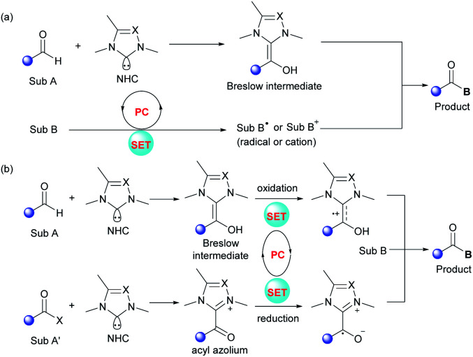 Fig. 1. Two representative activation modes of synergistic NHC/photoredox catalysis.