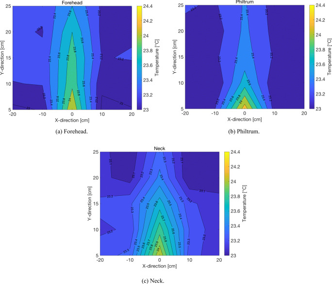 In figures, we can observe that the temperature distribution above every region is similar, but the magnitude of the temperature has little difference. At the 5 cm vertical distance above the forehead, the measured temperature near he central point and central line is higher than the TTBL, which means some part of this region has a thickness of TTBL between 5 cm to 10 cm.