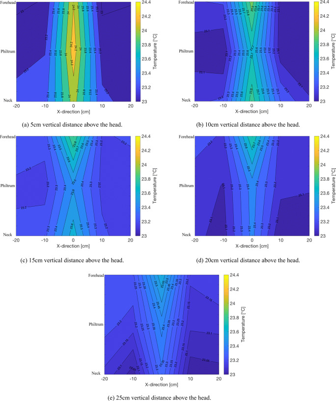Temperature distribution above the head (nose breathing mode). (a) 5 cm vertical distance above the head. (b) 10 cm vertical distance above the head. (c) 15 cm vertical distance above the head. (d) 20 cm vertical distance above the head. (e) 25 cm vertical distance above the head