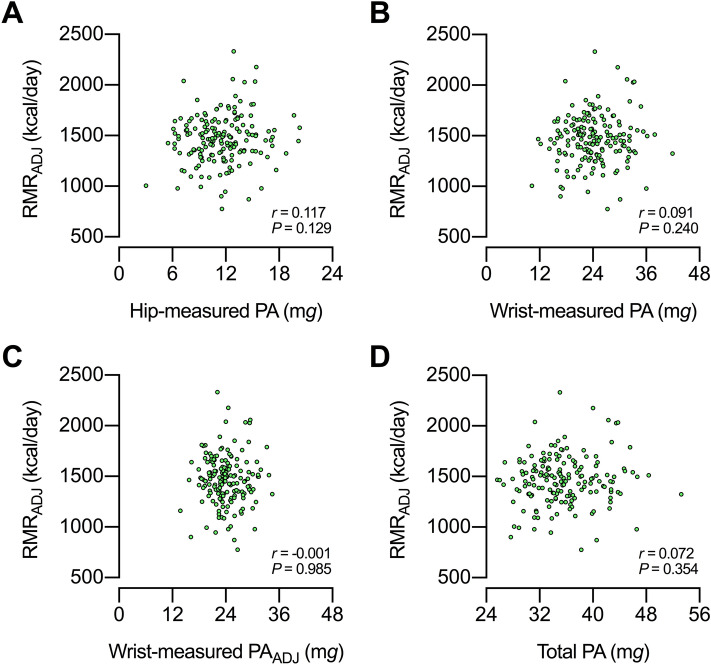 Association between resting metabolic rate [RMR] and physical activity [PA] in adults. RMR adjusted for lean mass [RMRADJ] was associated with (A) hip-measured PA, (B) wrist-measured PA, (C) wrist-measured PA adjusted for hip-measured PA [wrist-measured PAADJ], or (D) total PA [hip-measured PA plus wrist-measured PAADJ]. n = 169.