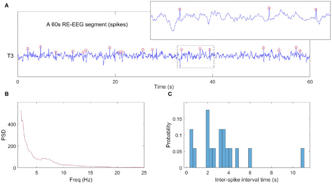 Furthermore, we display more details implicated in Figure 11 taking one point as an example (marked by the circle). The real RE-EEG segment at this point is shown in Figure 12A, from“patient 1”. Figure 12B illustrates the simulated RE-EEG segment, which is obtained as the model output Vp setting values for μ, gh to their optimized values that and and using nominal values for other parameters. The power spectra of simulated EEG is in good agreement with that computed from the real data (Figure 12C) and the distribution of inter-spike intervals (ISI) of both simulated EEG and real one are mainly concentrated at lower inter-spike intervals, reflecting the higher spike rate in simulated EEG and real RE-EEG (Figure 12D).
