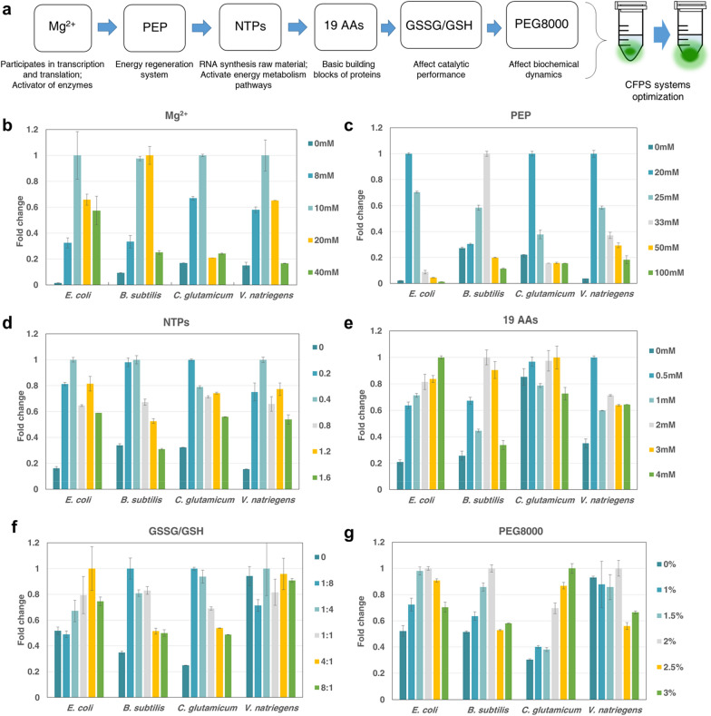 Effect of system reagent components on E. coli, B. subtilis, C. glutamate and V. natriegens CFPS systems. a Optimization process of reagent components in the system. b Mg2+. c PEP. d NTPs. e 19 AAs. f Redox environment. g PEG8000. Normalized treatment of sfGFP protein synthesis levelobtained by the system when using each reagent at a specified concentration. The mean and standard deviations are shown (N = 3). The number "1" of the normalized treatment represented the optimal fluorescence value of each factor in each CFPS system