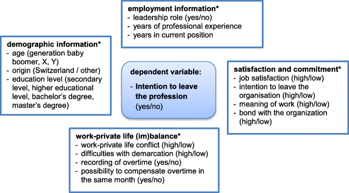 Third, we estimated a logistic regression model for the outcome variable ‘intention to leave the profession’ (see Fig. 2). Therefore, all variables included in the regression model presented in Fig. 1 were dummy-coded (yes/no or higher/lower than median) or included as metric variables (e.g. years of professional experience / in the current position). For the logistic regression model, all independent variables were included and selected using the stepwise backward algorithm (R-package MASS, function stepAIC) and the Akaike Information Criterion (AIC). To test for multicollinearity between the regression coefficients, the variance inflation factor (VIF) was used. In addition, the explained variance (R square), the exponentiation of the beta coefficient, beta coefficient, standard error, z-values and p-values (2-tailed) were calculated. Since the assumption of homoscedasticity was not met, p-values were computed based on bootstrap (r = 1000 bootstrap, bias corrected and accelerated, 95 % CI). Data was analysed using R 3.6.0.