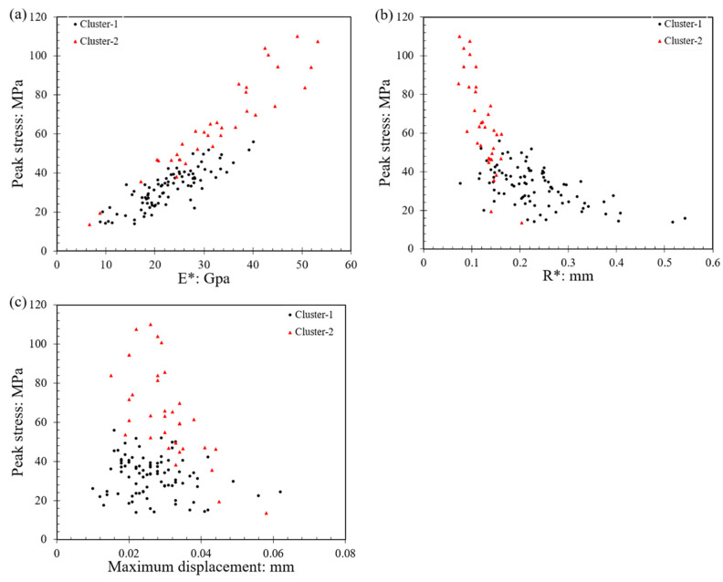 Note that LBS, as natural grains, display some variabilities in their morphological and elastic characteristics and the resultant contact modulus depends on the specific pair of grains (i.e., there is some influence of the surface roughness and meso-scale morphology as well as the specific composition of each grain). Based on the studies by Sandeep and Senetakis [24,25], an E* value of 30 GPa could be considered as “representative” for LBS grain contacts. Thus, after the estimation of the equivalent radius, the derivation of the stress at failure from Equations (3) and (4) was performed in two different ways: (i) all the pairs of grains (referred to as specimens) were assumed to have E* = 30 GPa and this analysis was adopted for both speeds used in the study, thus for the total set of 244 tests, and (ii) E* values were estimated for each individual specimen based on the initial part of the force–displacement curves, thus each given pair of grains displayed its own contact Young’s modulus. The latter analysis was carried out only for the 122 tests performed at 0.01 mm/min so that a sufficient number of experimental data could be used for a reliable Hertz-fitting implementation (Table 1).