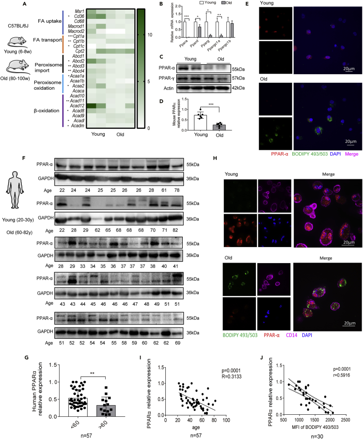 (H and I) (H) Immunofluorescent labeling of LD (green) and PPAR-α (red) in young and old human CD14+ monocytes (violet). DAPI (blue) was used to stain the nuclei. (I) The correlation of PPAR-α expression with age was analyzed.