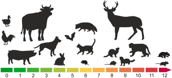 Représentation visuelle du système de notation pour la sensibilité de différentes espèces animales au SRAS-CoV-2 de zéro (espèces résistantes) à 12 (espèces les plus sensibles) d’après Michelistsch et al. [45]. Zéro à 3 points ont été attribués pour chacune des quatre variables suivantes : détection du génome viral après l’inoculation, séroconversion, transmission intra-espèces et aspects cliniques. Avec l’aimable autorisation de la revue « Advances in virus research ».