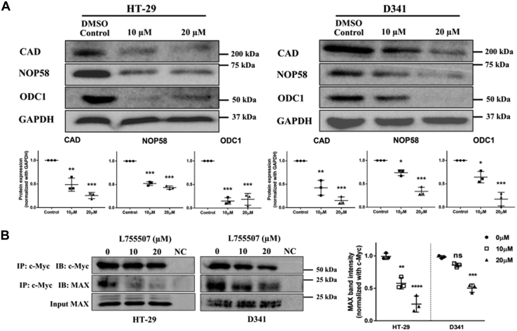 For coimmunoprecipitation, D341 and HT-29 cells were treated with different concentrations of L755507 for 36 h. After harvesting, the cells were washed with ice-cold PBS, and the pellet was lysed with IP lysis buffer (50 mM Hepes, 300 mM NaCl, 1% Triton X-100, 10 mM MgCl2, 15% glycerol, pH 7.9) supplemented with Halt Protease Inhibitor Cocktail. The lysate was cleared by centrifugation at 16,000g for 15 min at 4 °C. 50 μg of cellular lysate was incubated with 3 μg of anti-Myc mouse primary antibody at 4 °C overnight. Furthermore, 1 mg of prewashed SureBeads Protein G (Cat No. 161-4023, Bio-Rad) was used to precipitate the Myc–MAX complex by incubating at 4 °C for 4 h. The magnetized Protein G beads along with precipitate were further washed trice with IP wash buffer (25 mM Hepes, 300 mM NaCl, 0.2% Triton X-100, pH 7.9), resuspended in the protein loading buffer, and separated via 12% SDS-PAGE. Negative and input Myc control was used for comparison in all sets of experiments. Furthermore, MAX was immunoblotted by anti-MAX rabbit primary antibody, and input Myc was immunoblotted by anti-Myc mouse primary antibody. The list of antibodies used in coimmunoprecipitation is provided in Table S1.