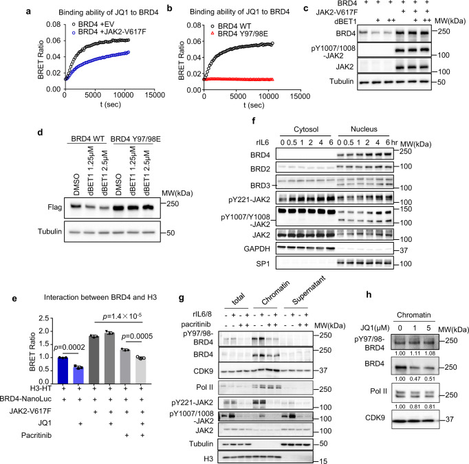 a NanoBRET report assay determining the binding ability of JQ1 to BRD4 in 293T cells transfected with BRD4 and active JAK2-V617F or empty vector. b NanoBRET report assay determining the binding ability of JQ1 to BRD4 in 293T cells transfected with BRD4-wild-type or BRD4-Y97/98E. c Representative western blot analysis (n = 3) of indicated proteins in 293T cells transfected with indicated constructs and treated with dBET1(1.25 μM, 2.5 μM). d Representative western blot analysis (n = 3) of indicated proteins in 293T cells transfected with flag-BRD4 or flag-BRD4-Y97/98E followed by dBET1 treatment. e NanoBRET™ BRD4/Histone H3.3 Interaction Assay in 293T cells determining the interaction between BRD4 and histone H3.3 under different conditions. 293T cells were transfected with BRD4-NanoLuc and histone H3.3-HaloTag with/without active JAK2-V617F as indicated, then were treated with indicated inhibitors. f Representative western blot analysis (n = 2) of indicated proteins from cytosol and nucleus of PDC1 cells treated with 20 ng/ml rIL6 for indicated time. g Representative western blot analysis (n = 3) of indicated proteins from WCL, chromatin, and supernatant of PDC1 cells treated with 50 ng/ml rIL6/8 and/or 2.5 μM pacritinib. h Representative western blot analysis (n = 2) of indicated protein from chromatin of PDC1 cells treated with 20 ng/ml rIL6 followed by JQ1 treatment. In e, data is presented as the mean ± SD (error bars) of three biological replicates. The p values were determined using two-tailed Student’s t tests.
