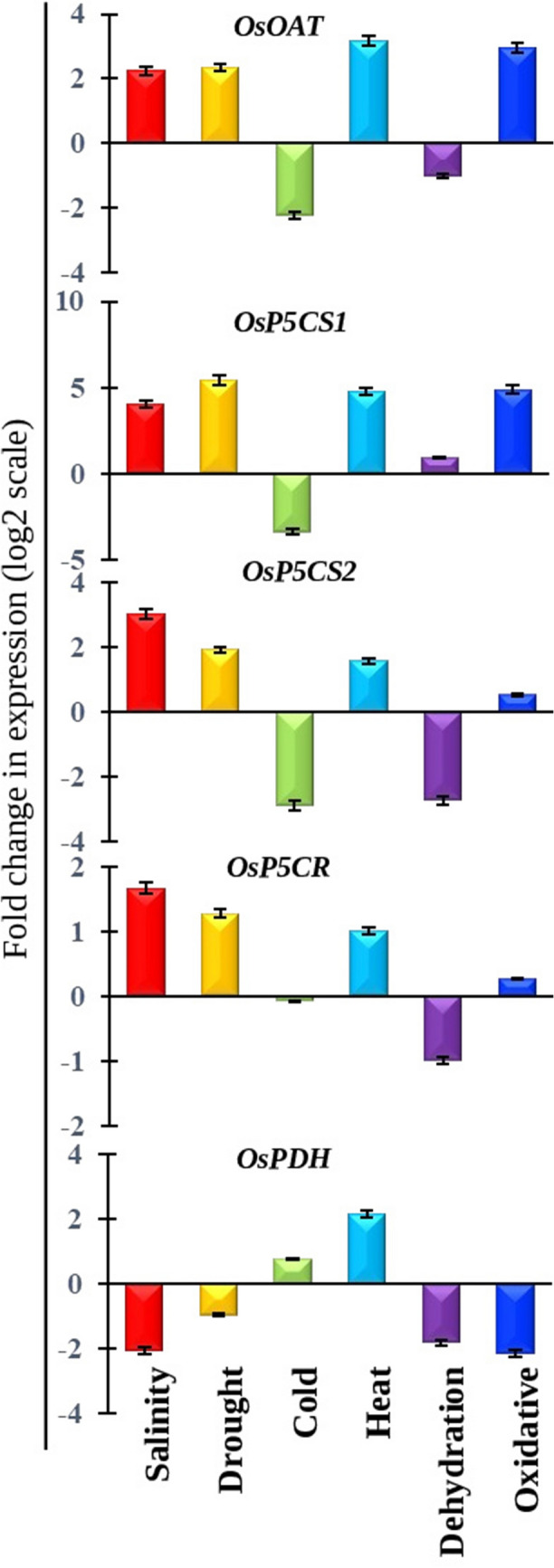 Functional validation of proline metabolizing gene’s expression in response to various abiotic stresses. Expression profiles of proline metabolizing genes were performed in response to salt, drought, cold, heat, dehydration, and oxidative stresses at a Bangladeshi rice variety. Quantitative RT-PCR was used to investigate the expression levels of each gene. The log2 scale of fold change in each gene under each condition was presented. The results were represented by the mean value of fold change ± standard deviation using eEF gene as a reference gene