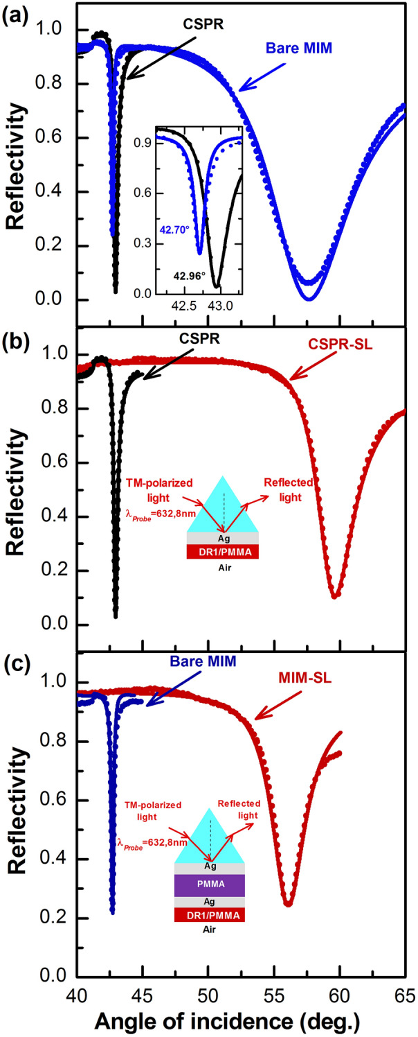 Figure 4 shows the TM-ATR spectra as a function of the incidence angle which we obtained for the samples of MIM and CSPR structures, prepared without and with the adsorbate. Figure 4a shows that the ATR spectrum of the bare MIM structure, exhibits a sharp resonance dip at a lower incidence angle compared to the mode of bare CSPR structure, and the FWHM for MIM is smaller than that of CSPR, i.e. for MIM versus for CSPR. Figure 4b,c show the -scan ATR spectra measured for CSPR and MIM sharp mode without and with the DR1/PMMA adsorbate film; respectively.