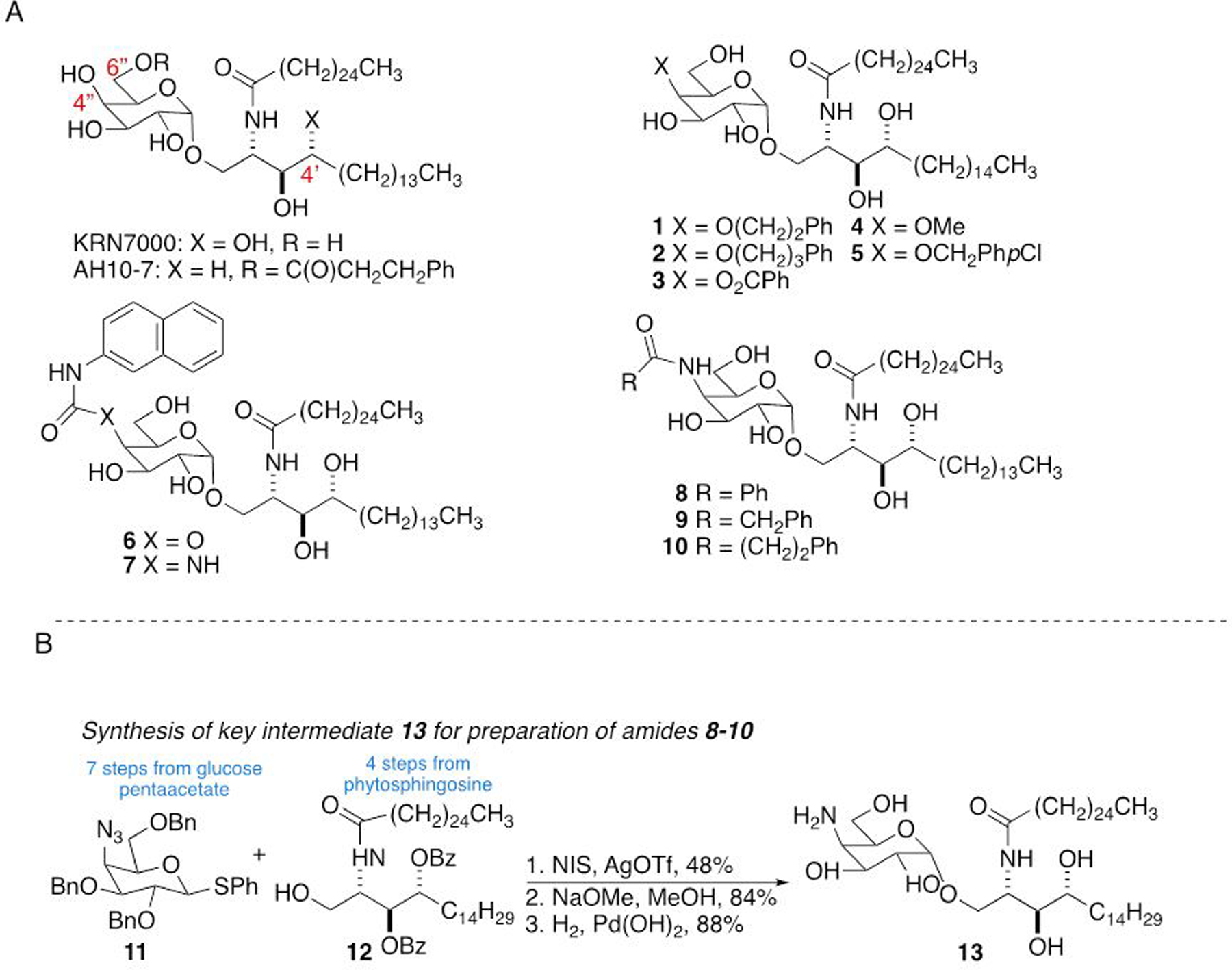 A) KRN7000 is the prototypical α-GalCer antigen for iNKT cells. AH10-7 is a C6”-modified α-GalCer prepared and evaluated by us previously. Compounds 1–7 are representative C4”-modified α-GalCer derivatives previously described in the literature (see text for references). Amides 8–10 are the focus of this work. B) Synthetic strategy for the preparation of 8–10.