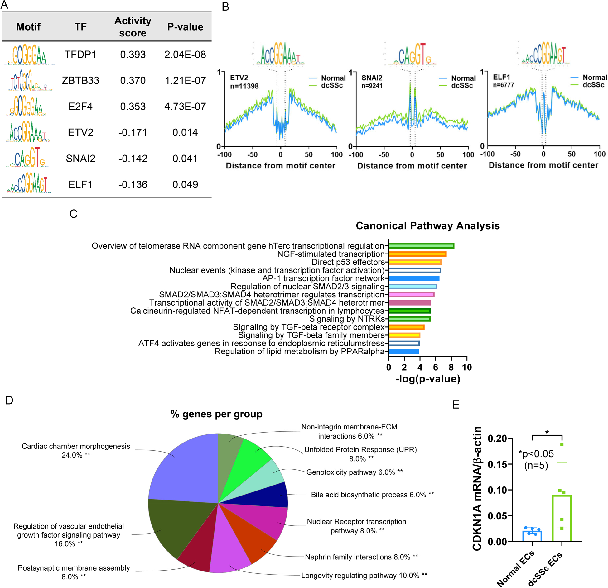 The most enriched transcription factor motifs and their target genes in SSc ECs. (A) HINT-ATAC motif analysis of regions in normal and dcSSc ECs. The top 3 transcription factors with significant differential activity values in ECs are shown. The activity score indicates the difference in activity in normal compared to dcSSc ECs (Normal-dcSSc). A positive score indicates increased transcription factor binding in normal ECs, and a negative score indicates increased binding in dcSSc ECs. The consensus sequences of transcription factor motifs are illustrated, and the height of the letter represents how frequently that nucleotide is observed in that particular position in each motif. (B) The footprint profiles of ETV2, SNAI2, and ELF1 generated from ECs. (C) Pathway analysis of the putative transcription factors identified in ECs. The top 14 are shown. (D) Pathway analysis of differentially accessible genes in dcSSc ECs that overlap with ETV2-target genes reported in Liu et al. (E) The expression of CDKN1A in dcSSc ECs is significantly increased compared to normal ECs. n=number of subjects. Data are shown as mean +/− S.D.