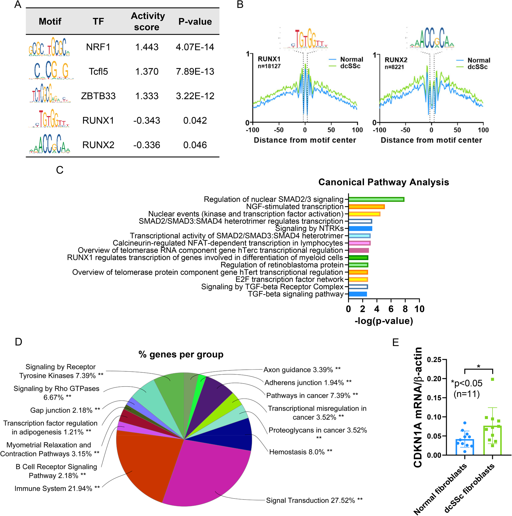 The most enriched transcription factor motifs and their target genes in dcSSc fibroblasts. (A) HINT-ATAC motif analysis of regions in normal and dcSSc fibroblasts. The top 3 transcription factors with significant differential activity values in fibroblasts are shown. The activity score indicates the difference in activity in normal compared to dcSSc fibroblasts (Normal-dcSSc). A positive score indicates increased transcription factor binding in normal fibroblasts, and a negative score indicates increased binding in dcSSc fibroblasts. (B) The footprint profiles of RUNX1 and RUNX2 generated from fibroblasts. (C) Pathway analysis of the putative transcription factors identified in fibroblasts. The top 14 are shown. (D) Pathway analysis of target genes regulated by both RUNX1 and RUNX2 identified using the CHEA Transcription Factor Targets database. (E) The expression of CDKN1A in dcSSc fibroblasts is significantly increased compared to normal fibroblasts. n=number of subjects. Data are shown as mean +/− S.D.