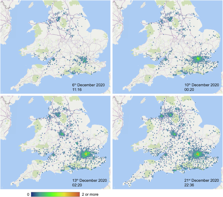 The temporal and geographic spread of VOC 202012/01 in December 2020, seen from the perspective of Alderley Park high-throughput testing facility, Lighthouse Labs Network. The supporting information video map displays detailed spatio-temporal spread. Locations displayed on the Map resulted from the subject postal district and date tested at Alderley Park. Cases displayed on the Map were accumulated over the assessed period in chronological order, generating the heat map. Heat map: indicative density of postal districts affected by at least one case of S-gene target failure in the areas highlighted by colors (see color bar). Map coverage: 98% of cases listed in Table S2 under column “cases of S-gene target failure” were matched with locations in the assessed time range. Accuracy: 95% of matched locations were displayed with high confidence on the map. The combination of map coverage and accuracy resulted in ∼93% of total cases from Table S2 linked to their locations and, their postal district indicated on the heat map.