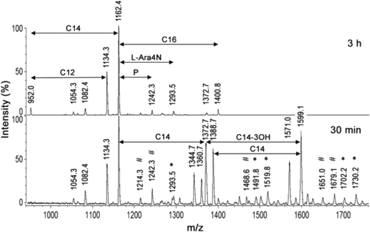 Marked peaks represent molecular species containing two phosphates and one L-Ara4N (∗) or three phosphates without L-Ara4N (#). P, L-Ara4N, C12, C14 and C16 represent m/z shifts corresponding to phosphate, 4-amino-4-deoxy-L-arabinose, laurate, myristate and palmitate substituents, respectively.