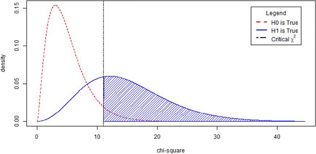 A central χ2 distribution with df = 5 (dashed red line), and a noncentral χ2 distribution with df = 5 and λ = 10 (blue solid line). The shaded area corresponds to the statistical power with α = 0.05