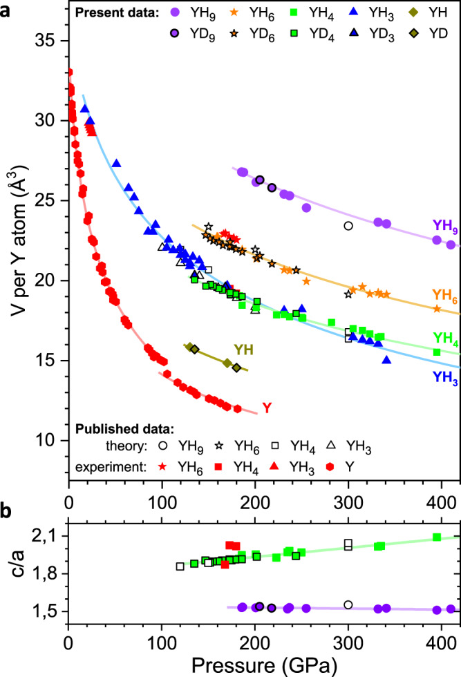 The synthesis of YH10, which, according to theory, is the most promising candidate for the highest Tc of 305−326 K23, was of particular interest for the present study. The calculations on the stability of fcc-YH10 provide contradictory results. Some predictions show that this phase becomes stable at 250 GPa23, which is an apparent contradiction with our observations. Other calculations suggest that at T = 0 K, YH10 is thermodynamically unstable at any pressure22. However, the difference in the Gibbs free energies between fcc-YH10 and hcp-YH9 should decrease at higher temperatures, and fcc-YH10 should become more favourable at temperatures above 1500 K at 375 GPa or above 1100 K at 400 GPa22.