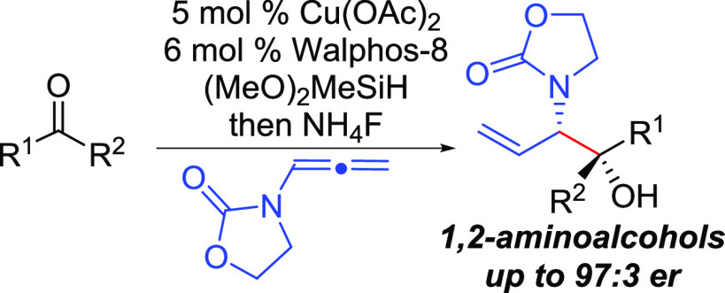 In conclusion, we have disclosed an enantio- and diastereoselective aminoallylation of ketones by Cu-catalyzed reductive coupling to access useful chiral protected 1,2-aminoalcohols. Identification of an unprecedented reversible ketone addition step that appears to be unique to N-carbamoyl substituted aminoallylation intermediates derived from the hydrometalation of allenamides having important implications on asymmetric induction was reported. Future investigation into the unique reactivity of these systems for asymmetric synthesis is ongoing.