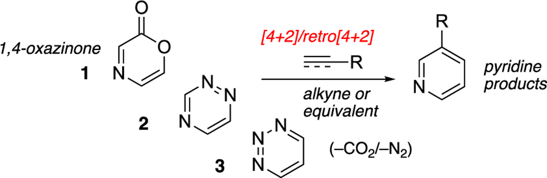1,4-Oxazinones (represented by general structure 1) are complementary substrates in [4 + 2]/retro[4 + 2] tandem sequences leading to pyridines. Recent computational efforts suggest that oxazinones are the most reactive precursors for the [4 + 2] reaction component (of the tandem cycloaddition/cycloreversion sequence) and proceed readily with either electron-rich or electron-deficient substrates to yield pyridine products after loss of carbon dioxide.7 Because of the increased reactivity, 1,4-oxazinones are attractive substrates that can enable the use of less reactive 2π cycloaddition reaction components and/or permit use of milder reaction conditions.8 In this way, ubiquitous alkyne precursors may be used routinely and at reaction temperatures that are operationally convenient for the practicing chemist. Pyridine synthesis using oxazinone precursors was established from the foundational work of Hoornaert9 and co-workers but remains obscure in comparison to use of triazines.