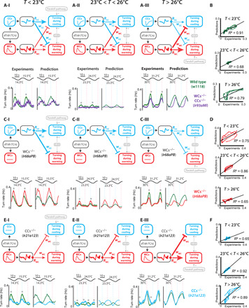 (A) Top: Schematic representation of the model in wild-type larvae below (A-I), near (A-II), and above (A-III) the homeostatic set point. The lines that represent the contributions of WCs and CCs to warming and cooling turning, respectively, were drawn with a thickness that is proportional to the weights wWC and wCC. Bottom: Experimental results and model predictions of the turning rate responses of wild-type larvae (w1118 in green) and larvae defective for WCs and CC function (w1118; Ir93aMI05555 in purple). (B) Correlation between experiments and model predictions. (C) Top: Schematic representation of the model in larvae defective for WC function below (C-I), near (C-II), and above (C-III) the homeostatic set point. Bottom: Experimental results and model predictions of the turning rate responses of wild-type larvae (w1118 in green) and larvae defective for WC function (w1118; Ir68aPB in red). (D) Correlation between experiments and model predictions. (E) Top: Schematic representation of the model in larvae defective for CC function below (E-I), near (E-II), and above (E-III) the homeostatic set point. Bottom: Experimental results and model predictions of the turning rate responses of wild-type larvae (w1118 in green) and larvae defective for CC function (w1118; Ir21a123 in cyan). (F) Correlation between experiments and model predictions. Shaded regions are SEMs. Asterisks indicate different mean turning rate during cooling or warming between the two overlaid turning rate responses in each panel using chi-square test with Bonferroni correction (P < 0.005). w1118 in green: n = 80 in (A-I), n = 50 in (A-II), and n = 62 in (A-III). w1118; Ir93aMI05555 in purple: n = 42 in (A-I), n = 45 in (A-II), and n = 55 in (A-III). w1118; Ir68aPB in red: n = 61 in (C-I), n = 59 in (C-II), and n = 55 in (C-III). w1118; Ir21a123 in cyan: n = 45 in (E-I), n = 54 in (E-II), and n = 49 in (E-III).