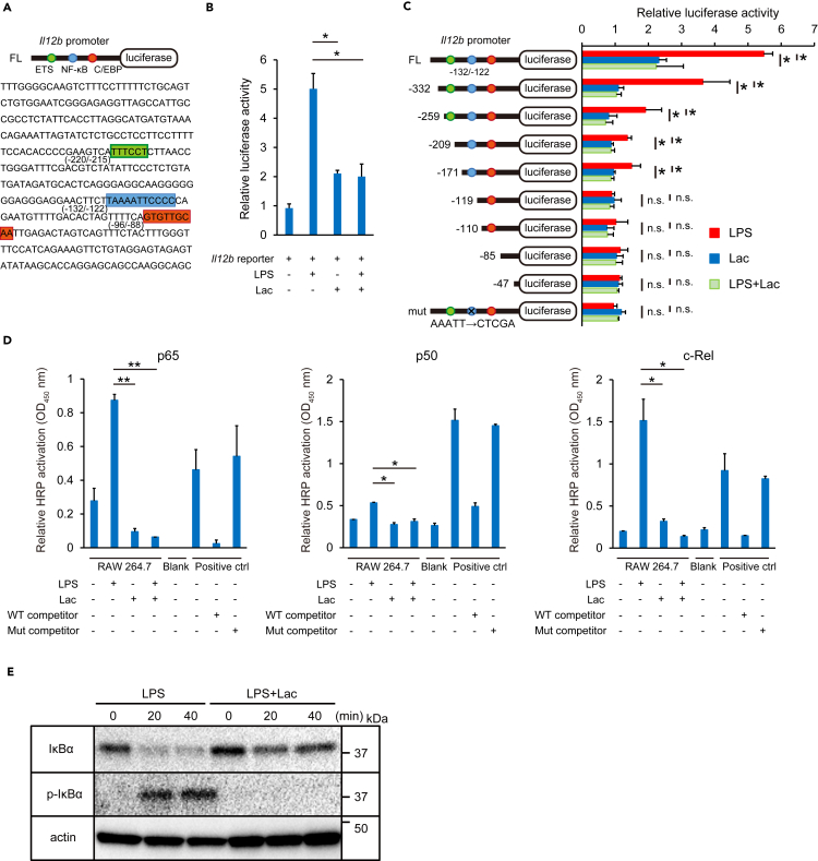 (B) Luciferase assays. The mouse Il12b promoter luciferase reporter construct was transfected into RAW 264.7 cells. Cells were activated with LPS (100 ng/mL) and/or Lac (20 mM) at 24 hr post-transfection, and luciferase activity was measured 24 hr after stimulation. Relative luciferase activity was determined compared with non-activated control cells.
