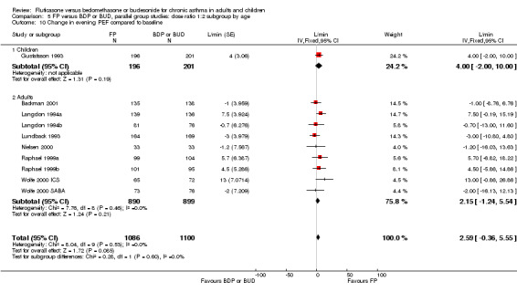 The particular inhaled corticosteroid that was being ICS compared with FP (i.e. BDP or BUD), patient age (children or adult), delivery device (identical or different devices used for FP and BDP/BUD) and asthma severity were our a priori subgroups.