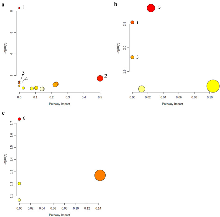 Overview of the scatter plots of the metabolic pathways changed by a single dose of amphetamine (5 mg/kg) in a plasma 1 h, b plasma 8 h, and c urine 8 h after administration. The color of the dots is based on the negative decadic logarithm of the p value. Dark color indicates a more significant pathway. The dots radius complies with the pathway impact value. Statistically significant pathways (p < 0.05) are numbered from 1 to 6. 1 = aminoacyl-tRNA-biosynthesis; 2 = phenylalanine, tyrosine and tryptophan biosynthesis; 3 = valine, leucine, and isoleucine biosynthesis; 4 = ubiquinone and other terpenoid-quinone biosynthesis; 5 = glycine, serine and threonine metabolism; 6 = arginine biosynthesis