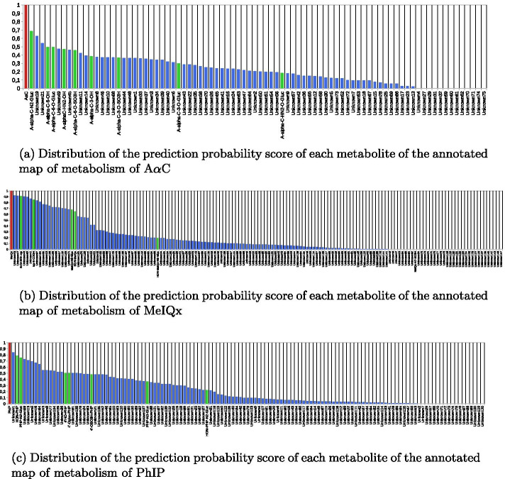 The 11 known metabolites (green nodes) have the largest scores. The 12 unknown predicted metabolites are represented with a blue bar.
